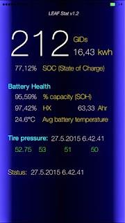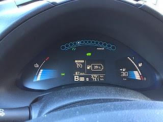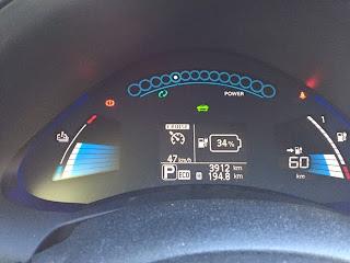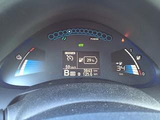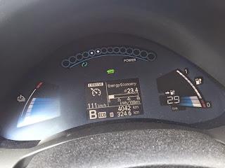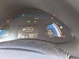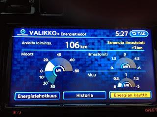 Alkumatka oli vesisateessa maantieajoa 12-tien kautta Hämeenlinnaan. Ajovalot olivat koko matkan automatiikan päälle kytkemät ja lämmityslaite +20c automaattisäädöllä koko ajan päällä. Silti lämmityslaite ei oikeastaan lainkaan vienyt virtaa. Valot ja lasinpyyhkijät sen sijaan kyllä veivät pientä siivua koko matkan ajan.