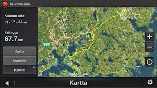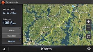 Carwingsin sivujen kautta suunniteltuna lyhin reitti, ja sama myös auton navigaattorin eco-reittinä ilmoitti matkaksi 135km / suunta.