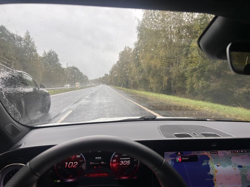 Koeajoautossa ei ollut ajoavustinpakettia, joten kuljettajana sain vastata lähes täysin auton ohjaamisesta. Vain hetkittäin sateisella ja kuraisella moottoritiellä kaistallapitoavustin yritti kohteliaan hienovaraisesti puuttua ajolinjaan. Totesin mersun ohjauksen mielekkään tunnokkaaksi maantiellä. Silti omaan autooni haluaisin ehdottomasti ajoavustinpaketin, minkä toimintaa en nyt siis päässyt testaamaan ja vertailemaan.