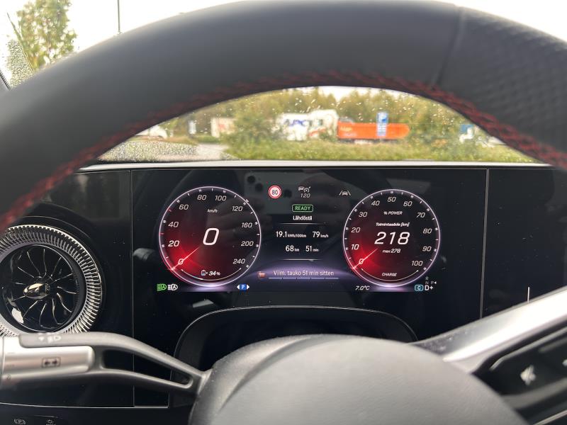 Mercedes-Benz CLA 250+ akuston nettokapasiteetti on 85 kWh ja sille on ilmoitettu WLTP-yhdistetty toimintamatkan pituudeksi 792 kilometriä, mikä on jo erinomainen lukema. Tämän kertainen kulutustestini oli autolle raskas, mutta 19,1 kWh:n keskikulutuksellakin toimintamatka olisi toteutunut 445 km tasolla. Latausasemalta jatkoin matkaa takaisin autoliikkeeseen ja matkaa oli kertynyt 95 kilometriä ja koko sen matkan keskikulutus oli 18,0 kWh/100 km, millä kulutuksella akku riittäisi noin 472 km matkan verran. Uskon, että Suomalaisia maanteita ajellessa kesällä toteutuu noin 550 - 650 km toimintamatka ja talvella sekä kesäisillä moottoritierajoituksilla sitten jonkin verran vähemmän. Joka tapauksessa tällä autolla taittaa pitkiäkin päiväsiirtymiä vaivatta.