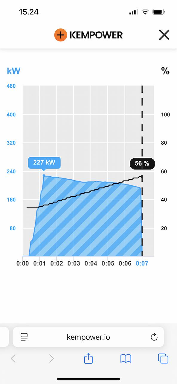 Joka tapauksessa, aloittamalla latauksen 34 % varaustasolta, kävi lataustehon huippu hetken aikaa 227 kW:n tasolla ja lähti siitä hyvin hitaaseen laskuun, kunnes 56 % varaustason kohdalla lopetin latauksen.
