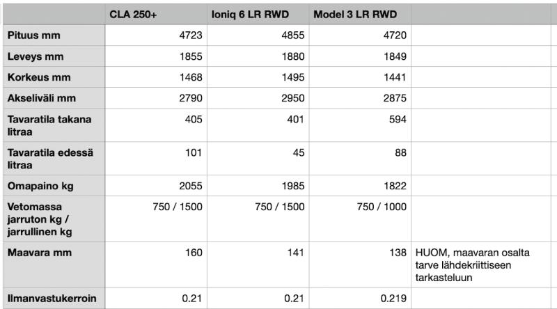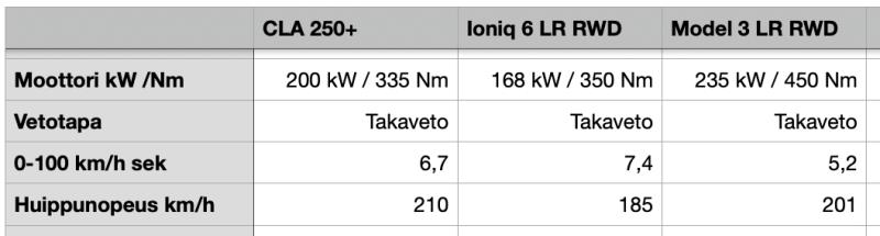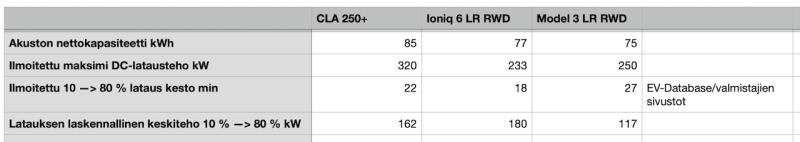 Uskon kuitenkin, että CLA on erittäin taloudellinen auto etenkin suomalaisittain nopeassa moottoritieajossa, kuten ovat myös vertailukolmikkoni muutkin kaksi autoa.Lataustehon osalta myös totean autoista ainakin CLA:n ja Ioniq 6:den riittävän samalle tasolle, joskin MB:n yli 300 kW:n huipputeho on tuntuvasti vielä Hyundaita enemmän. Model 3 jää näistä hieman vääjäämättä lataustehoissa jälkeen.