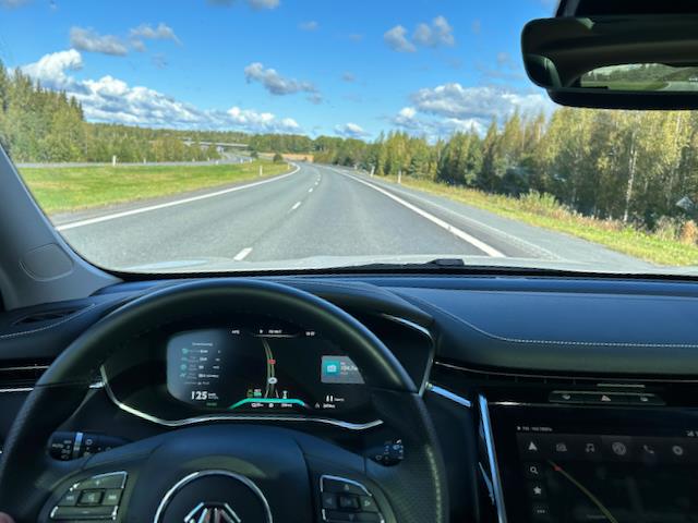 Moottoritiellä asetan vakionopeussäätimeen 123 km/h, jolloin todellinen nopeus vastaa GPS:llä tarkistettuna suurinta sallittua 120 km/h tasoa. Auton melutaso tuntuu mukavan vaimealta ja korvaan miellyttävältä. Tosin tässäkin autossa suomalainen karkea asfaltti nostaa melutasoa havaittavasti. Sanoisin melun olevan käytännössä samaa luokkaa kuin ID.4:ssäni, missä on tuplalasit edessä.