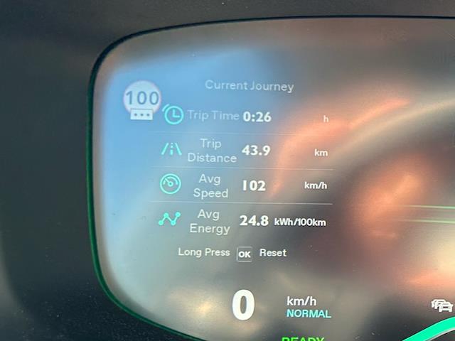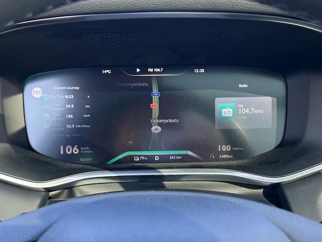 Koeajoni oli jälleen sama lyhyehkö edestakainen 44 km pituinen pätkä Tampereen moottoritielle, mitä olen toteuttanut useilla eri sähköautojen koeajoilla. Nyt pääsin ajamaan kesäisiä ajonopeuksia melko hyvin ja keskinopeus muodostui lähdön ja kääntöpaikan hidasteiden johdosta 102 km/h tasolle. Keskikulutus lenkillä asettui 24,8 kWh/100 km tasolle.