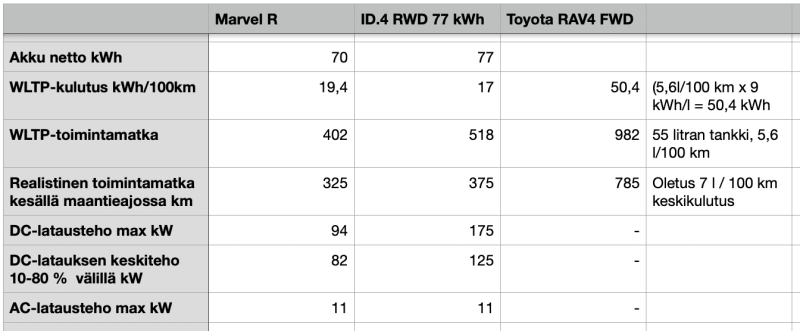 Marvel R WLTP-kulutus on suurempi kuin ID.4:ssä ja akun nettokapasiteetti on pienempi, joten myös WLTP-toimintamatka on lyhyempi. Uskottava kesäinen maantieajon toimintamatka Marvel R:llä on hieman yli 300 km. Polttomoottoriverrokin kulutus kilowattitunteina on hurjan näköinen, mutta polttoainetankin energiamäärä on toki niin paljon suurempi, että auton toimintamatka on jonkin verran pidempi.