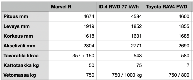 Marvel R on vertailun autoista pisin ja levein sekä siinä on suurin akseliväli. Tavaratila on litroina ilmoitettuna joukon pienin, mutta sitä katsellessa mielikuva on kuitenkin hieman litroja suuremmasta tilasta. MG:ssä takatilaa täydentää joka tapauksessa mukavan kokoinen sekä hyvin käytettävän muotoinen etutavaratila. MG:ssä vetomassa on sallittu näyteen ns mökkikärryn 750 kiloon, kun ID:ssä on takavetoisena jarrulliselle 250 kg enemmän. Huomiona haluan todeta, että vahvasti uskon RAV4:lläkin olevan kattotaakka sallittuna, mutta en löytänyt siitä maahantuojan sivulta nopealla etsinnällä tietoa.