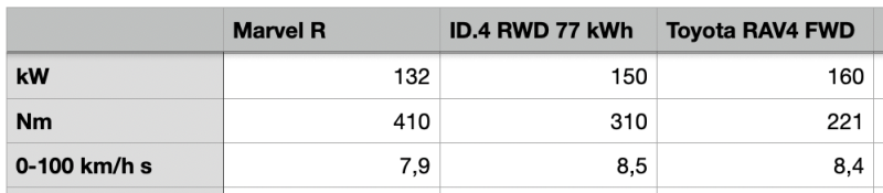 Marvel R:n moottorissa on vertailukolmikostani vähiten kilowatteja, mutta eniten nyyttonmetrejä. Kiihtyvyys 0-100 km/h on ilmoitettu nopeimmaksi. Marvel R:n erikoisuutena on sähköautoon edelleen harvinainen kaksinopeuksinen vaihteisto.