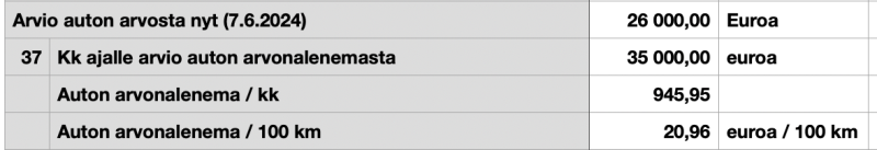 Lasken autolla arvonalenemaksi tässä vaiheessa peräti 35 000 euroa, mikä on hirvittävän paljon hukattua rahaa 37 kuukauden ajalle. Arvonalenema kuitenkin noudattaa lähes samaa kaavaa, mitä vuosikaudet paljon ajavana autoillani on toteutunut liikenne-energiasta huolimatta, eli auton arvo puolittuu ensimmäisen kolmen vuoden aikana. Nyt tosin kasvatin arvonalenemaa jonkin verran, vaikka olen auton ostanut ennen kaikkein kuumimman sähköautojen hintapiikin aikaa. Rahoituskuluja en laske tähän nyt lainkaan, koska rahoituksen todellinen vuosikorko oli vain murto-osan siitä, mitä olen saanut tuottoja sijoittamalla vastaavaa summaa kolmen vuoden rahoituksen ajan. Nyt auto on jo velaton, enkä viitsi myöskään kohdentaa negatiivisia rahoituskuluja vain sen tähden, että satuin saamaan niin matalan koron auton rahoitukseen ja muutama sijoitus vastaavalla ajalla sattui onnistumaan hyvin.