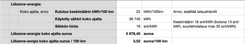 Olen arvioinut auton kokonaiskulutuksen mieluummin hieman yläkänttiin, 22 kWh/100 km tasolle ympärivuotisena keskikulutuksena koko ajalta sisältäen lataushäviöt. Lataussähkön hinnan arvioin 16 snt/kWh tasolle, koska suurin osa siitä on ladattu kotona ensin 13 snt/kWh hinnalla sekä vajaan puolen vuoden ajan 15 snt/kWh -hinnalla. Autoa on toki ladattu tuntuvasti myös julkisissa latauksissa.