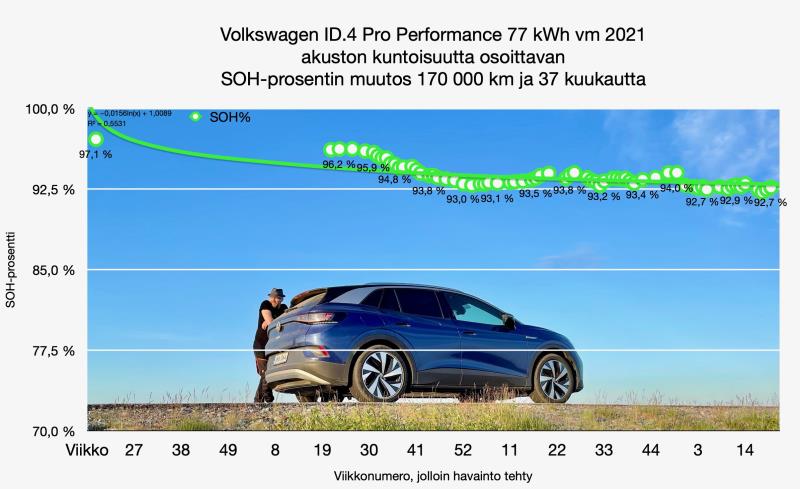 Akusto näyttää olevan noin 92 % - 93 % tasolla uudesta akustosta ja sen SOH-lukeman lasku on tasoittunut jo aika pitkäksi aikaa. Vanhenevan akuston vikaantumisen riskit tietenkin kasvavat, mutta onneksi ID:n akusto on modulaarisesti korjattavissa. Talvella hetkittäin lievää haittaa voi kokea akuston esilämmityksen puutteesta pidemien matkojen ensimmäisillä suurteholataustauoilla, mutta todellisuudessa niitä kertoja, että auton latautumista tuon takia olisi joutunut odottamaan on ollut enintään yksittäiset kerrat talvea kohden.
