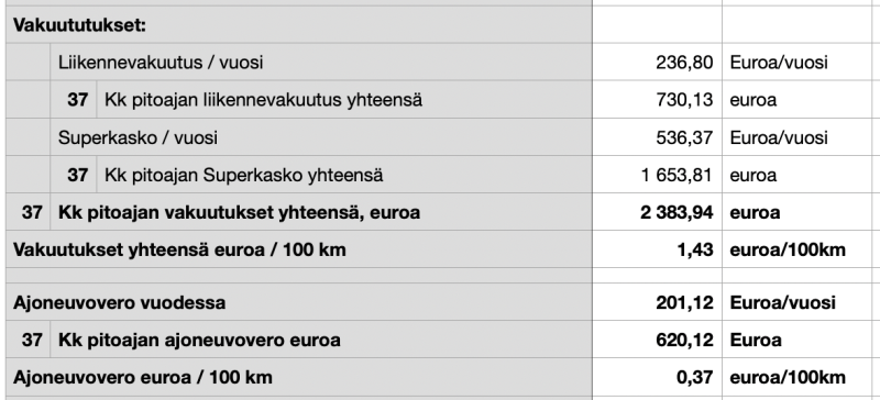 Yhteensä siis vakuutukset ja ajoneuvovero ovat tulleet maksamaan minulle koko auton pitoajalla 3004 euroa, eli 1,80 euroa / 100 km.