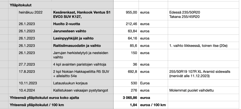 Huolto- ja ylläpitokulut tähän asti ovat olleet yhteensä 3065, 85 euroa, eli 1,84 euroa / 100 km. Tyypillinen polttomoottoriauto olisi käynyt määräaikaishuolloissa tässä vaiheessa jo viisi kertaa ja kuudes olisi aivan kohta edessä. Niistä huolloista tyypillisesti kolme olisi ollut pienempiä huoltoja ja kaksi sekä seuraava olisivat olleet tai olisi isompi huolto. Jos autossa olisi jakopäänhihna, niin senkin vaihtokulut olisivat jo realisoituneet. Vanhasta polttomoottoriajasta muistaen arvioin, että vastaavan bensiiniauton määräaikaishuoltoihin olisi kulunut rahaa jo noin 2000 - 3000 euroa. Siihen päälle keskimäärin muut satunnaiset kulut, kuten on mennyt nytkin, niin arvioin että vastaavan bensiiniauton huolto- ja ylläpitokulut olisivat toteutuneet noin 5000 - 7000 euron välille. Arvioin säästöpotentiaalin sähköautollani olleen huolloissa noin 2000 - 3000 euroa. Yhteensä siis liikenne-energiassa + huolto + ylläpito -kuluissa tähän mennessä säästöpotentiaaliksi arvioin noin 13 000 - 18 000 euroa.