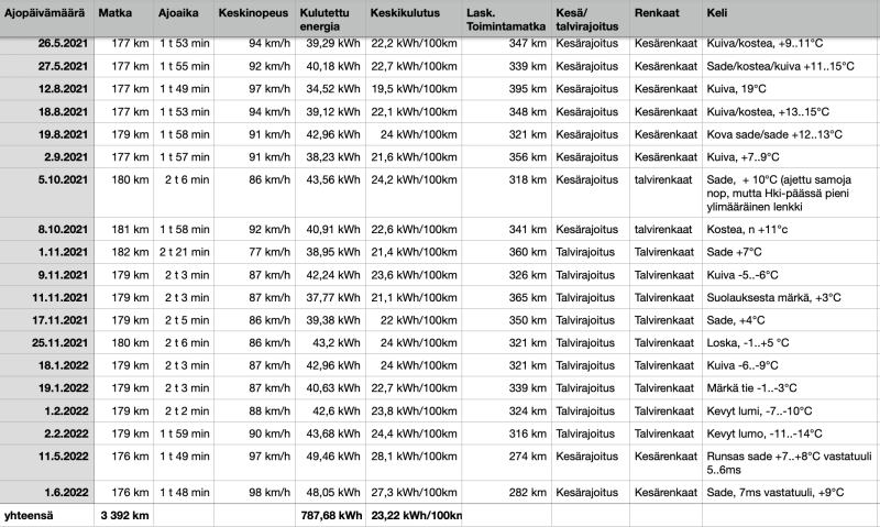 Ajan melkoisen usein Tampere - Helsinki - Tampere -väliä päiväreissuina. Olen satunnaisesti pitänyt kirjaa kulutuksista ja ne ovat vaihdelleet ympäri vuoden kirjanpidossa parkkiruudusta parkkiruutuun ajoilla 19,5 kWh/100 km ja 28,1 kWh/100 km välillä. Matalin sekä korkein kulutus molemmat on ajettu kesärajoituksilla ja kesärenkailla, eli vesisade ja vastatuuli vaikuttaa yllättävän paljon sähköauton kulutukseen.