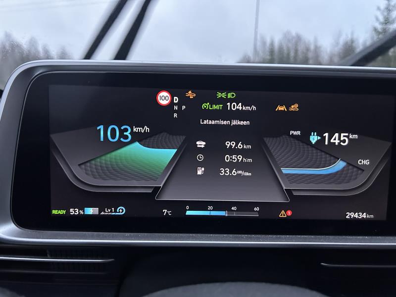Minulle tuokaan kutistunut toimintamatka ei ole mikään ongelma, koska Ioniq 6 latautuu suurteholaturilla niin nopeasti. Näillä testin kulutustasoilla 100 km lisää tomintamatkaa kertyy hieman alle 10 minuutissa ja 200 km hieman yli 20 minuutissa.