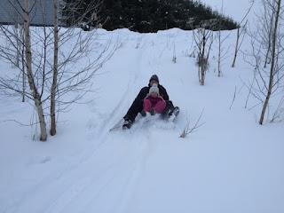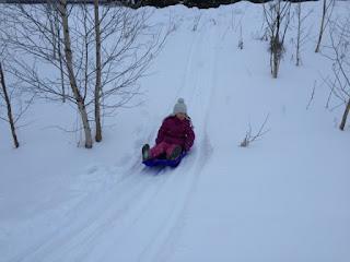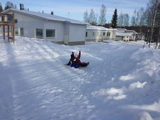 Hirvasen koulun johtajan neuvoilla tiesimme kävellä 1,2 km matkan. Lounastimme sen verran rauhalliseen tahtiin että päätimme keskittyä jälleen pulkkamäkeen.