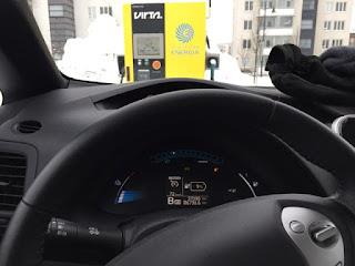 Kivääritehtaankadun pikalaturille saavuimme 10:15. Akkua oli jäljellä auton mittariston mukaan 8% ja LeafSpy näytti 2,2 kWh jäljellä olevaa energian määrää.
