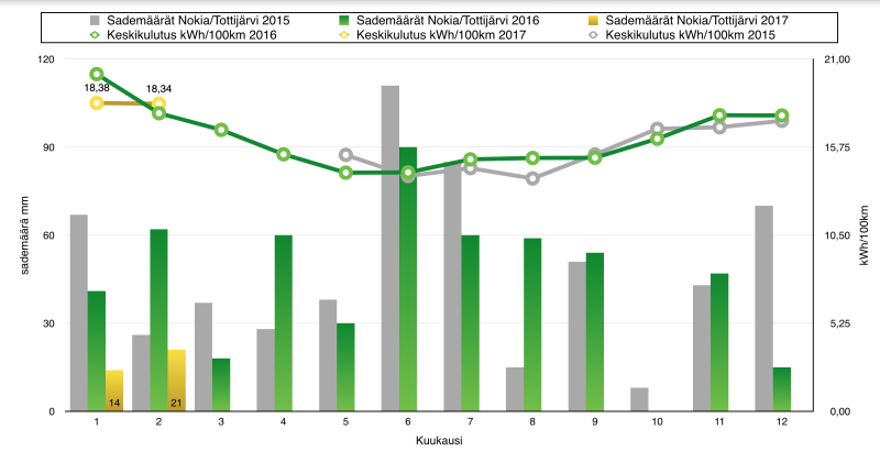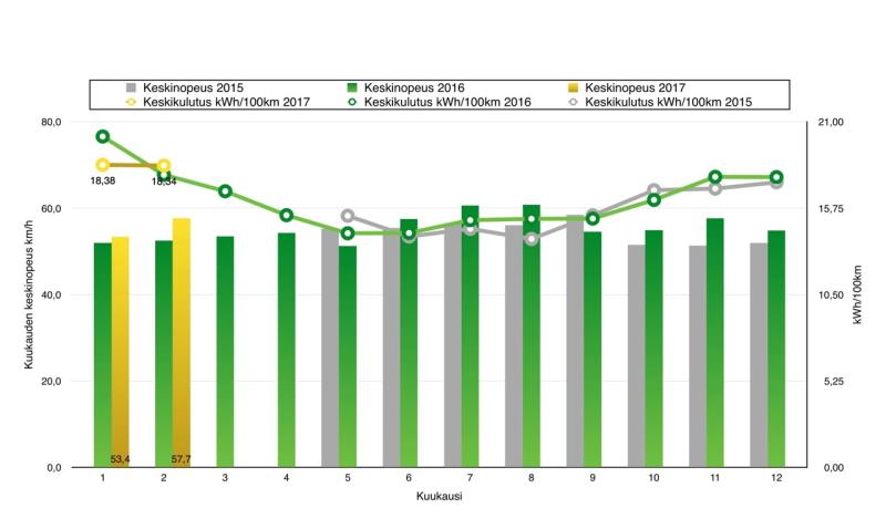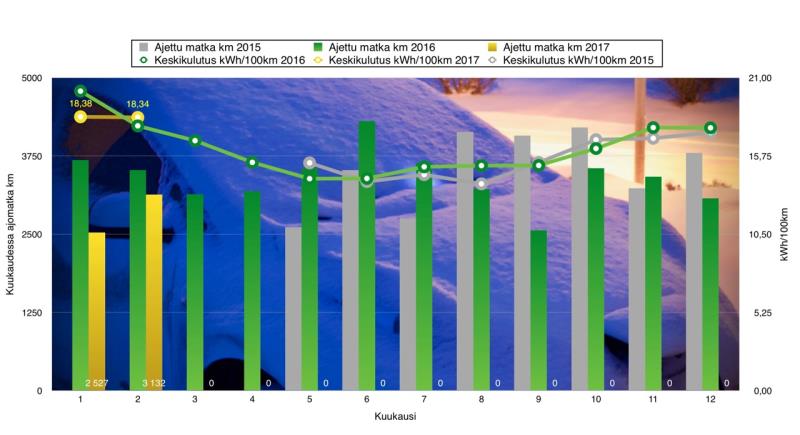 Ajoin helmikuussa 2017 hieman vähemmän kuin vuosi sitten, joka johtuu normaalista perheen ajojen vähentymisestä.