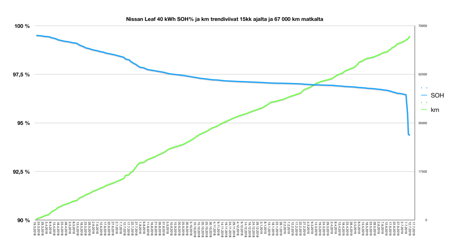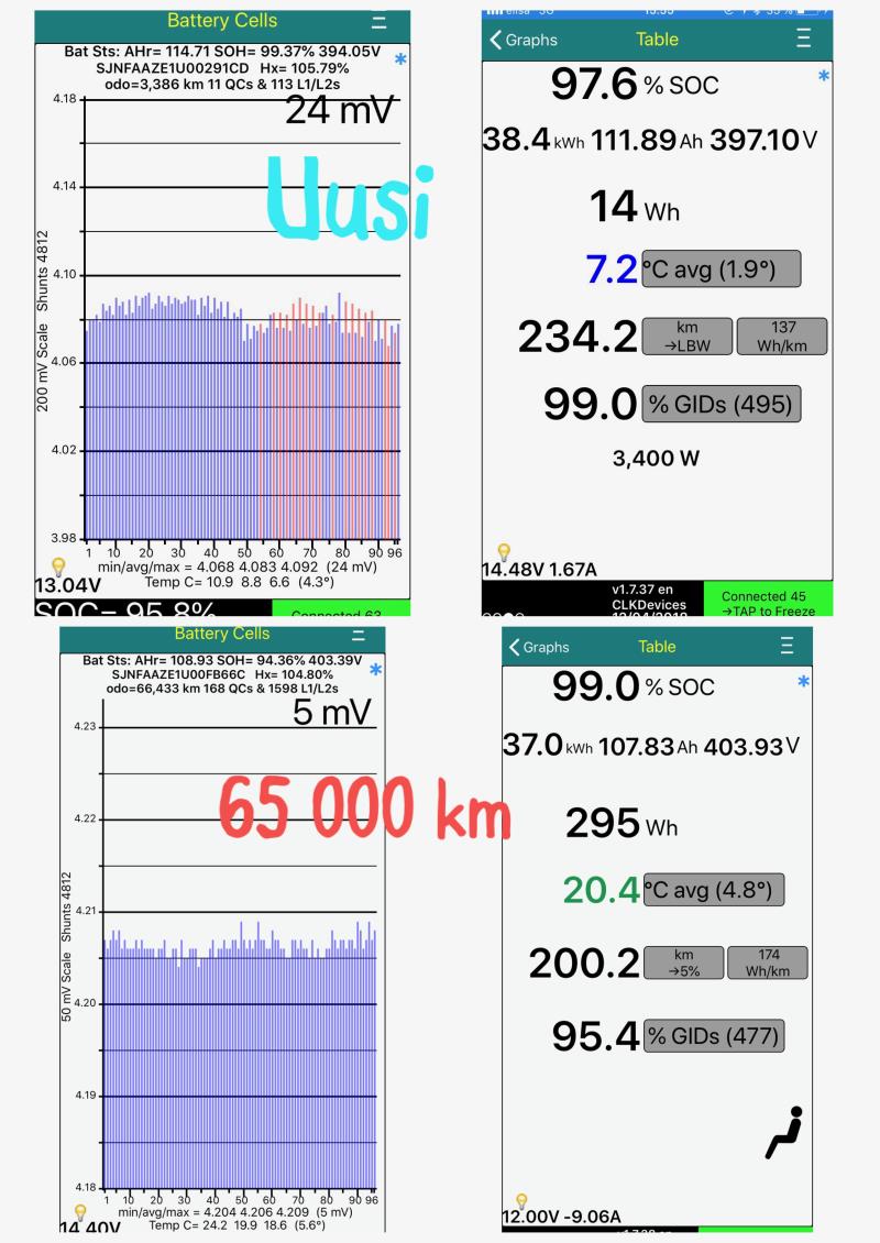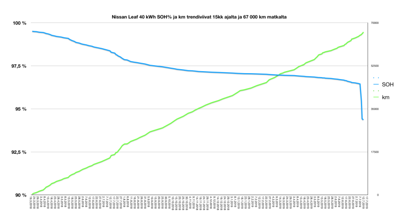 Olipa tuon SOH-dropin syy mikä tahansa, on oman Leafini akun kuntoisuus vieläkin hyvällä tasolla suhteessa muiden 40 kWh Leafien ajokilometreihin ja SOH-lukemiin, nimittäin vieläkin alempia SOH-lukemia näkee usein huomattavasti vähemmän ajetuissakin yksilöissä.