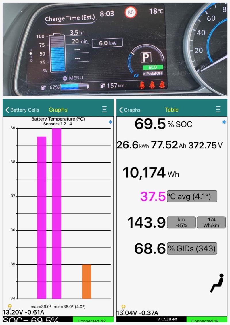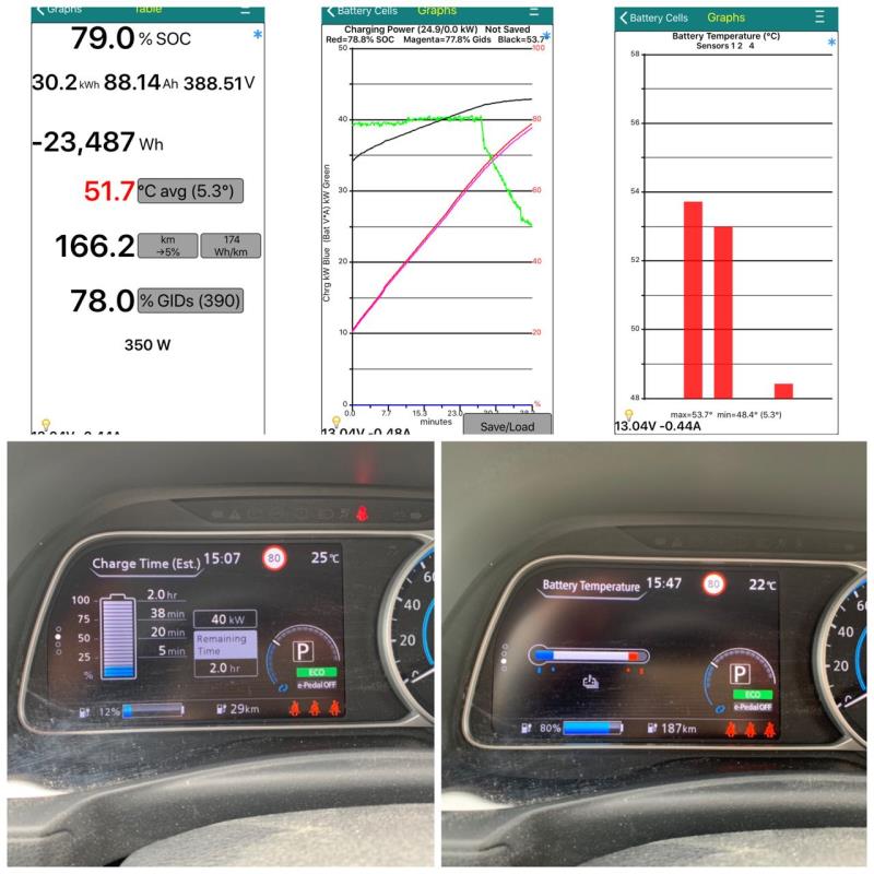 ABC:lle päästyäni ulkoilma oli lämmennyt jo mukavaan +25°C ja akut olivat jälleen lämmenneet tuntuvasti näyttäen 35,1..39,2°C lukemia. Tästä huolimatta 12% varausta näyttävään (7,7 kWh) akkuun upposi vielä 40 kW:n teholla pikalatausta. Tämä on BMS-päivityksen ansiota. Ennen päivitystä latausteho olisi ollut noin 31 kW:n tasolla, eli lähes 25% alhaisemmalla tasolla.