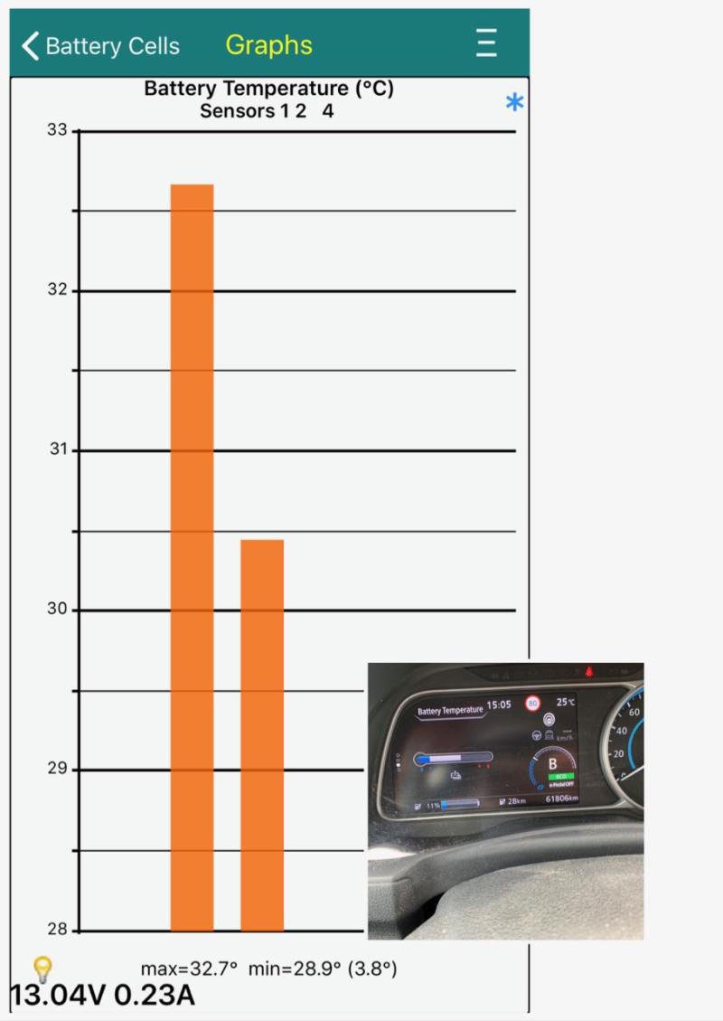 Palaveri päättyi siten, että noin 14.30 olin lähdössä kotimatkalle. Auton akut siis saivat jäähtyä viileässä parkkihallissa 5,5 tuntia. Silti paluumatkalle lähtiessä akut olivat edelleen 28,9..32,7°C lämmöissä.