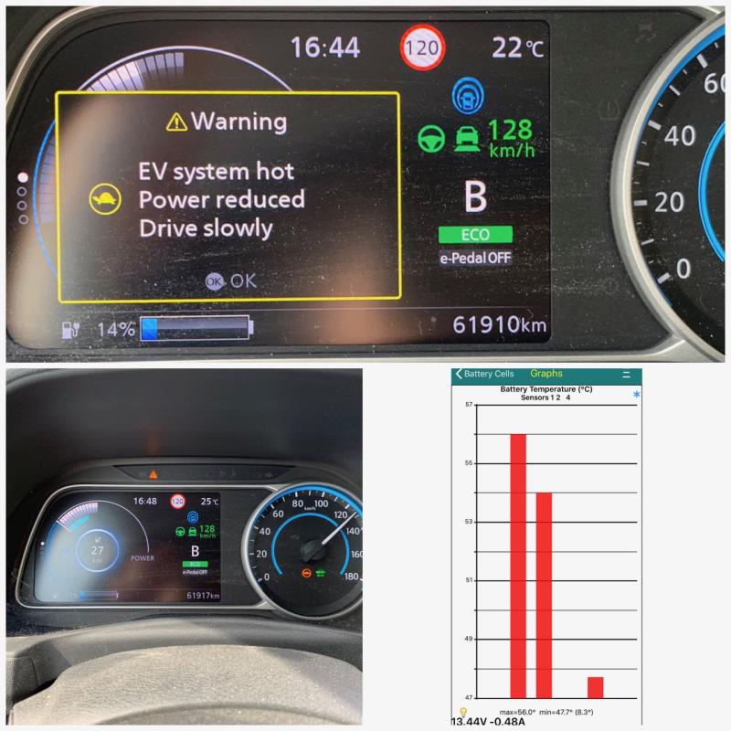 Jatkoin siis matkaa normaalisti vakionopeussäätimeen 128km/h nopeus asetettuna, jolloin todellinen nopeus on sallitussa 120 km/h moottoritienopeudessa. Lempäälän paikkeilla auto antoi jo virheilmoituksen, että EV-systeemi on liian kuuma, että ajelepas hitaammin. Tuolloin moottoriteho oli rajoitettu noin 40 kW:n tasolle. Silti täysi moottoritienopeus pysyi vaivatta vakionopeussäätimellä voimassa, joten jatkoin entiseen tahtiin matkaa. Akusto jatkoi kuumenemistaan ja hiukan ennen Tamperetta moottorista sai enää 28 kW:n tehon ulos. Kummasti Leafi jaksoi silläkin teholla pitää 120km/h nopeuden yllä, mutta kiihtyvyys oli tietenkin sangen verkkaista.