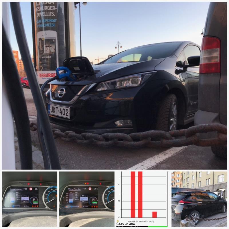 Perille Tampereelle päästyäni akussa oli 7%, eli 5,6 kWh energiaa ja akkujen lämmöt olivat nousseet jo 47,7..56,0°C tasolle. Tiesin jo valmiiksi, että nyt tulisi hitaasti pikalatausta Leafiin BMS-päivityksestäkin huolimatta.