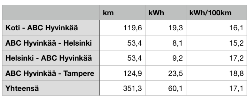 Onneksi omassa käytössäni asiaan on kuitenkin useita hyviä vaihtoehtoisia ratkaisuja. Listaan niistä tähän alle muutaman. Koko matkan kulutus oli 60,1 kWh ja matkaa kertyi 351,3 kilometriä, joten keskikulutus koko matkalla oli 17,1 kWh/100 km.