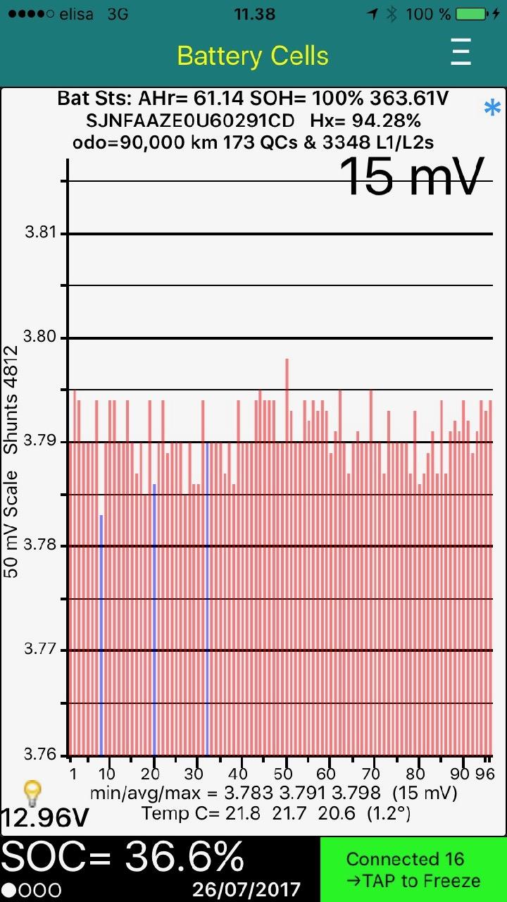 Akun kunnon näkee LeafSpy ohjelmistolla. Oheisessa kuvassa SOH100% kuvastaa akun kuntoa. Kuvasta myös ilmenee, että Leafini on AC-ladattu 3348 kertaa. Näistä lähes kaikki on tehty 6,6 kW:n latausteholla Type2-Type1 kaapelin avulla. DC-pikaladattu autoa on 173 kertaa. Enemmänkin näitä olisi kertynyt, jos Tampere-Jyväskylä -välillä vain olisi pikalatureita tarjolla.