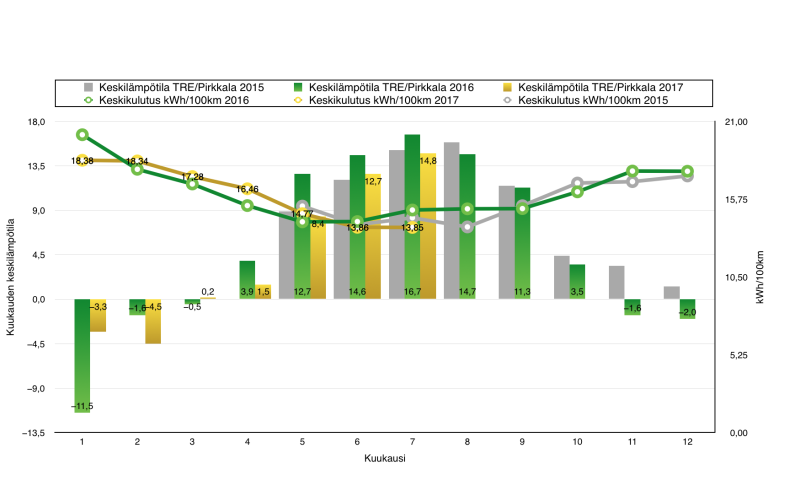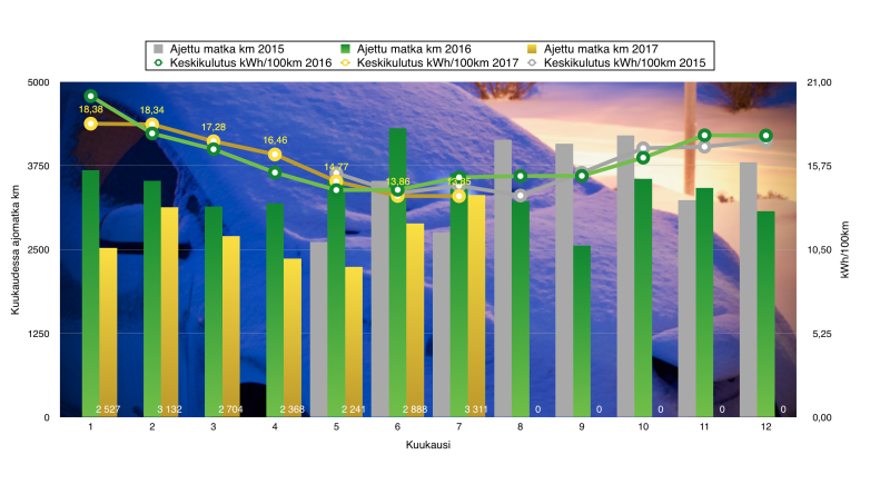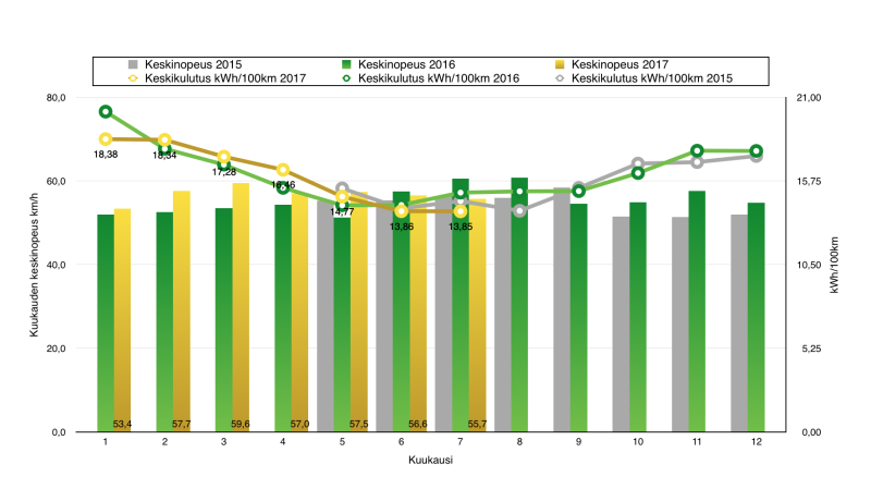 Leafin keskikulutus kuukausitasoilla summattuna on vaihdellut 13,87 kWh/100km ja 20,11 kWh/100km välillä. Pienin kuukausittainen kulutus koko ajalta oli nyt heinäkuu 2017 ja suurin on ollut 2016 tammikuussa, kun kovempaa pakkasta oli jonkin verran pidempään. Pakkanen sekä ajokeli ylipäätään vaikuttavat eniten Leafin kulutukseen. Toinen voimakkaasti vaikuttava tekijä on ajonopeus.