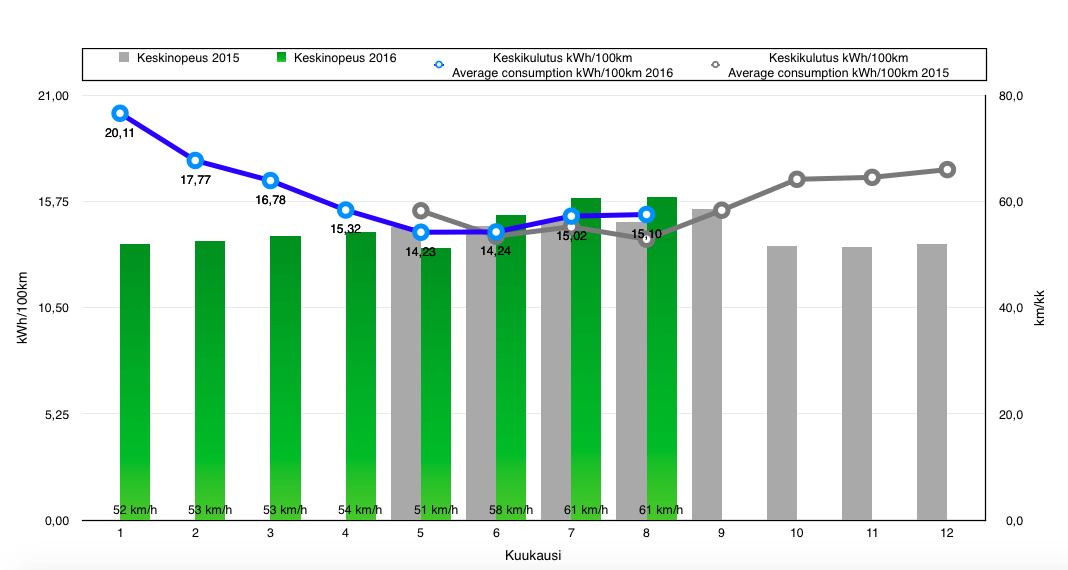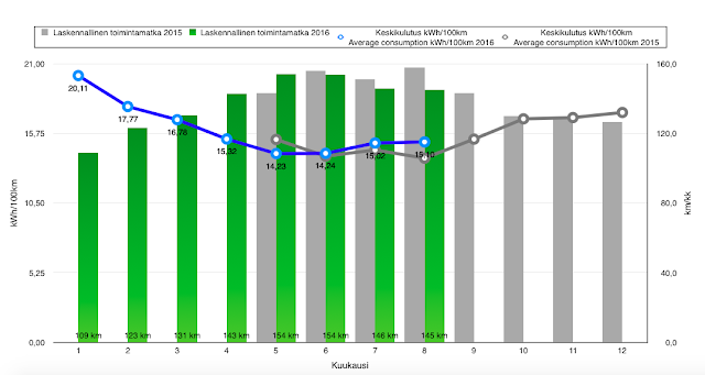 Elokuussa 2016 keskikulutus nousi edellisvuodesta merkittävästi, tosin 2015 vuoden elokuun 13,88 kWh/100 km on kaikkein alhaisin kuukauden keskikulutus.