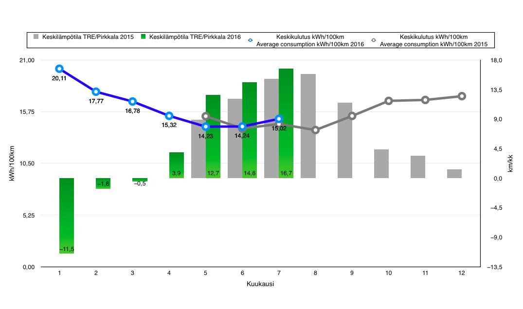 Alhaisimmat kuukauden keskikulutukset ovat olleet lämpimämpänä vuodenaikana kesä - elokuussa. Alhaisin kuukauden keskikulutus on ollut toukokuussa 2015, jolloin toteutui 14,23 kWh/100km.