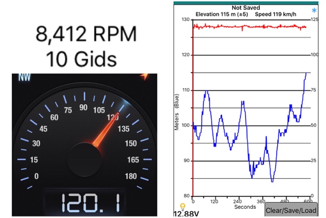 Nopeus oli vakionopeussäätimellä asetettu 133 km/h, jolloin kännykän GPS-mittaus sekä LeafSpy näyttivät 120km/h todellista nopeutta. Kyllä, Leafin nopeusmittarin virhe on edelleen kohtuuton.