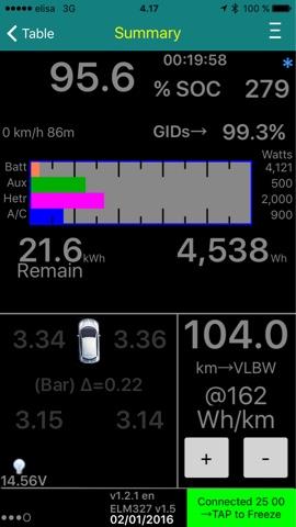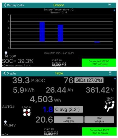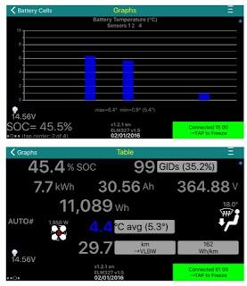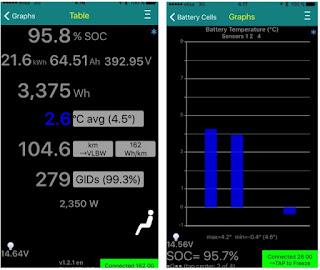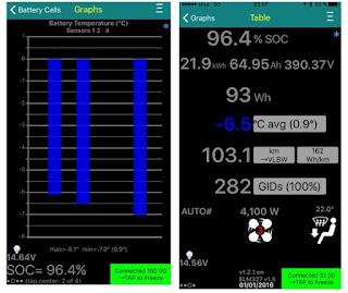 Auton mittaristo näytti ajoakulle 100% latausta, ja LeafSpy vahvisti akun lähtökapasiteetiksi 21,9 kWh. Samaisesta appsista tarkistin, että ajoakut olivat -7..-7,1 asteen välillä.
