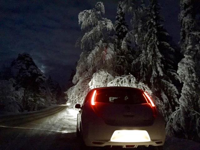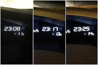 Minulla kului pari minuuttia kun kännykälläni dokumentoin lähtölukemia, ja auto kerkisi jo sillä aikaa lämmetä merkittävästi, joten Pipo takapenkille ja mukavan lämpimästä ratista kiinni ja liikenteeseen. Jo kotitien risteyksessä kello 23.11 eli vain kolme minuuttia käynnistyksestä autossa oli niin lämmin, että ulkona olevasta pakkasesta ei ollut enää tietoakaan!