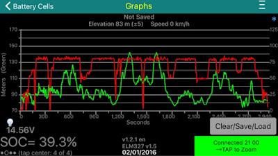 Jostain syystä tällä toistomatkalla tuli 100 metriä vähemmän matkaa, vaikka reitti oli täsmälleen sama. Ajoakut lämpenivät vielä hieman ajamalla ollen lopussa +0,9..+6,4 astetta.