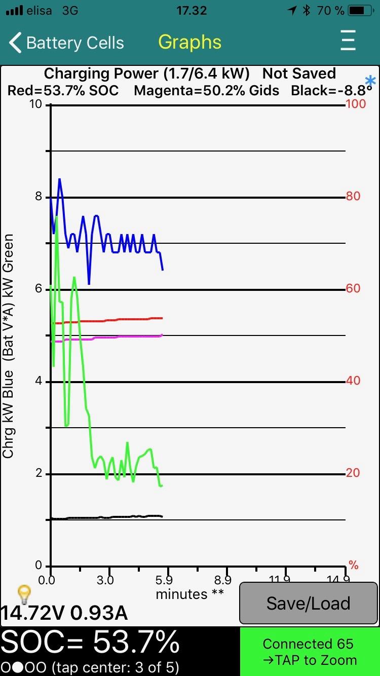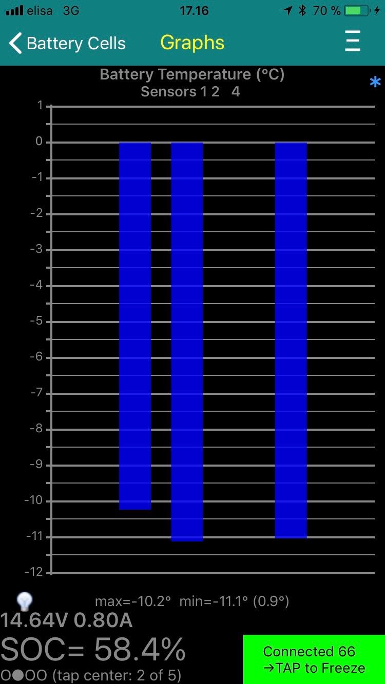 DC-lataaminen itsessään lämmittää akkuja yleensä niin paljon, että silloin niitä ei kannata vastuksilla lämmittää. Paremminkin niitä pitää jäähdytellä. Nyt tällä kertaa akut tosin eivät juuri lämmenneet edes DC-latauksen aikana, koska latausteho oli niin olematon.