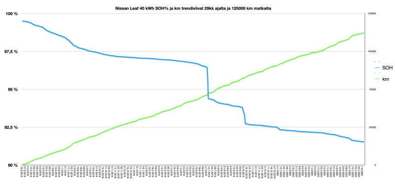 30 kuukautta vanhassa 126 000 kilometriä ajetussa Leaf 40 kWh:ssa oli SOH-lukema 91,4, eli auton akustosta saa ulos noin 34 kWh, kun uutena se antoi noin 37 kWh. Tuolla on merkitystä käytännön toimintamatkaan hieman, mutta ei ole vielä ratkaisevaa haittaa aiheuttava tekijä.