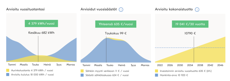 Alla kuva Fortumin aurinkolaskurista oman kiinteistöni ja valitsemani paketin tuotto- ja kulutusarvioista.
