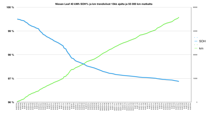 Nykyisen sähköautoni, eli Nissan Leaf 40 kWh -2018 akun kuntoisuutta osoittava SOH (State Of Health) laskee oheisen käyrän mukaan. Tällä hetkellä, eli noin 13 kuukautta vanhana ja noin 55 000 kilometriä ajettuna SOH on 96,87%. Alla olevasta kuvaajasta ilmenee, että talven kylmillä keleillä SOH:n lasku hidastui. Viime kesänä oli voimakasta laskua ja nyt jo heti kevään kelien lämmetessä näyttäisi SOH lähtevän laskemaan nopeammin. Mielenkiinnolla odottelen tulevan kesän vaikutusta.