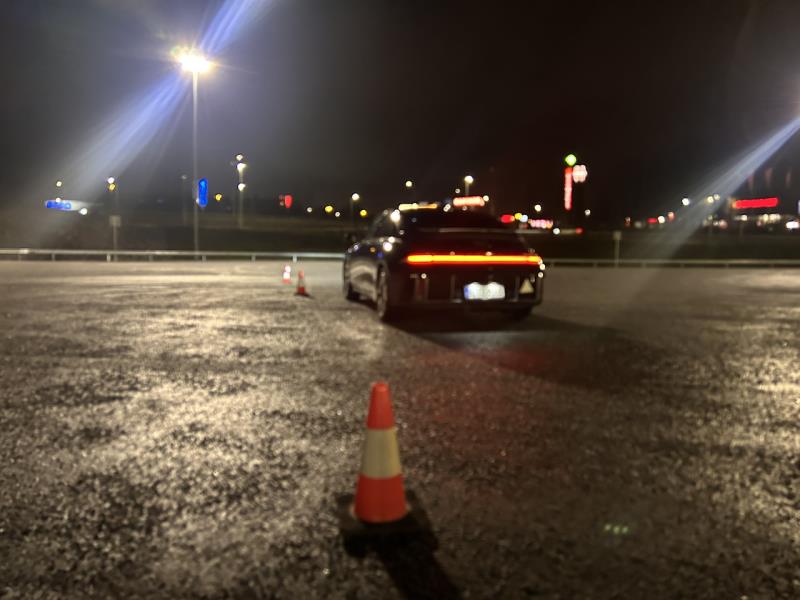 - Ensimmäinen liikkeelle lähteminen ja pysäyttäminen. Ensimmäinen liikkeelle lähtemisen harjoite tehdään eteenpäin ajamalla niin, että vapaata tilaa on reilusti sivuille sekä eteenpäin. Opastus on siirtää autoa vain jarrupoljinta kevyesti nostamalla ja hyödyntämällä Ioniq 6 -sähköautoonkin ohjelmalla rakennettua ryömintäominaisuutta hyödyntäen sekä joidenkin metrien siirtämisen jälkeen vauhdin tasainen pysäyttäminen jarrua hallitusti painamalla. Tämän jälkeen ensimmäinen peräytysharjoitus samalla tavalla, mutta heti opastaen peileihin katsomalla.