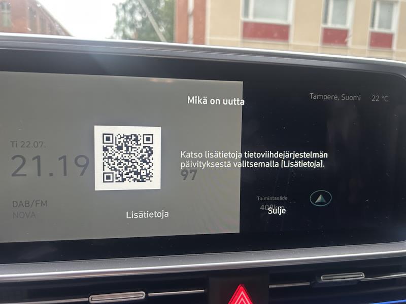 Ranskassa Euroopan matkallamme heinäkuussa 2025 auto alkoi ehdotella ohjelmistopäivitystä. Ensimmäinen reaiktiomme oli, että emme todellakaan sitä suorita kuin vasta kotiin palattuamme ja luimme ainoastaa huolella näytön teksteistä, että miten aina kuittaamme ilmoitukset niin, ettei päivitys vain pääse alkamaan.