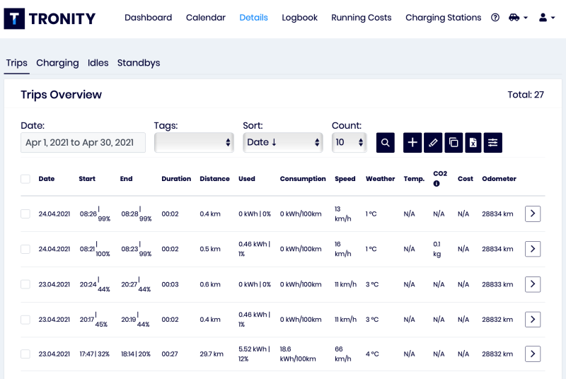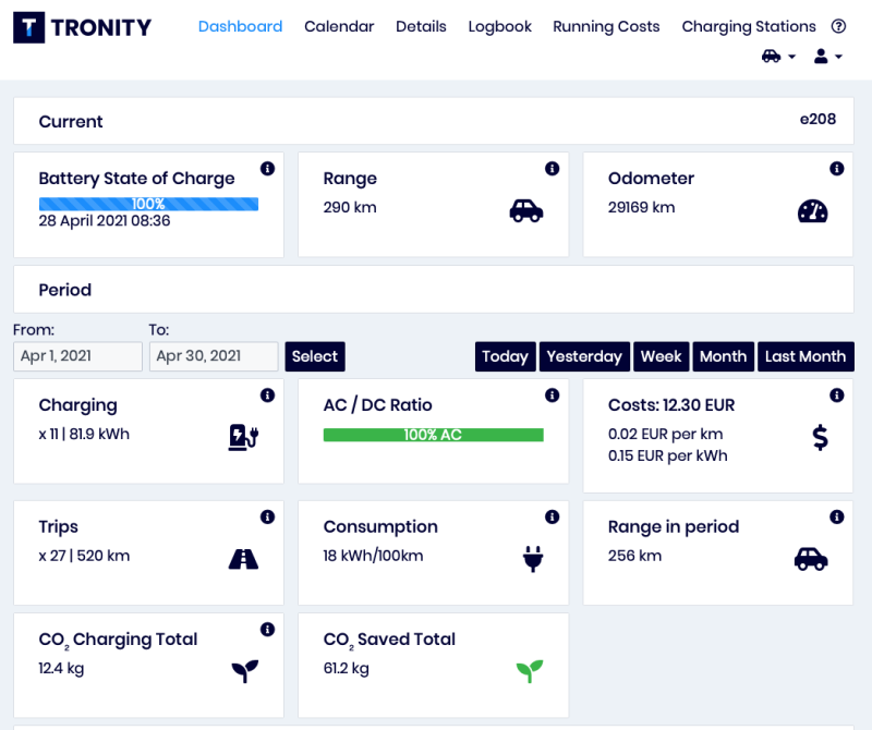 Tronity näyttää tietokoneen selaimella omalle tillille kirjautumalla vielä lisää informaatiota. Nyt vihdoin näen jälkikäteen e-208:n kulutustiedot haluamaltani aikaväliltä. Selaimella Tronity-tililtä näkee edellämainittujen mobiilisovelluksen tietojen lisäksi mm: