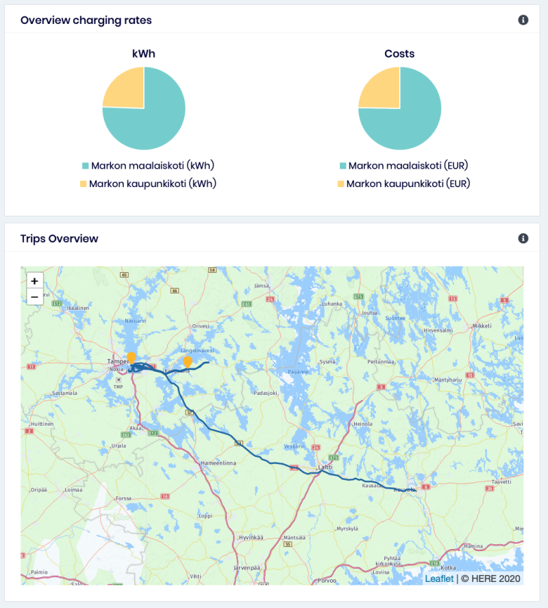 - Halutuilla aikaväleillä: Energian keskikulutus halutulla aikvälillä kWh/100km, piirasgrafiikkana latauskohteiden osuus ladatun energian kWh ja euroa sekä ajetut matkat kartalla ym.