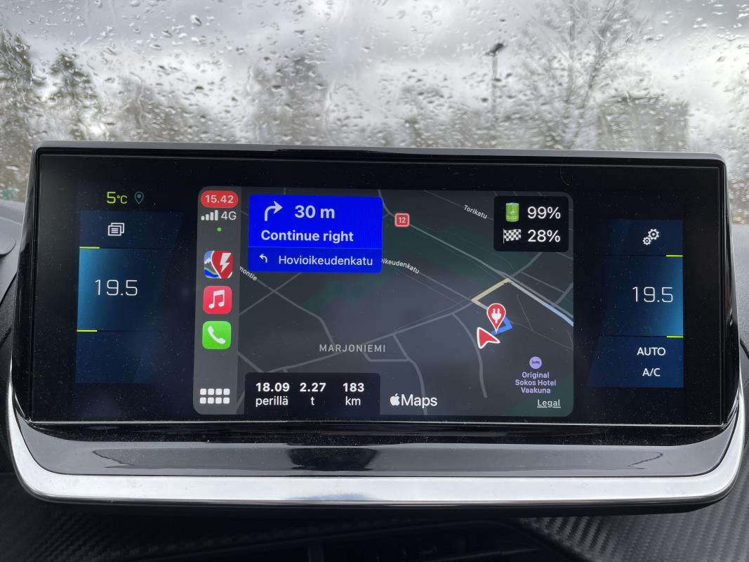Vihjeen perusteella onnistuin saamaan Peugeot e-208 sähköautoni infotainmentiin näkyviin akun varaustason prosentteina reaaliaikaisesti sekä navigoinnin kohteeksi määritellyssä paikassa perille päästyäni jäljellä oleva akun varaustason prosentteina. Mahtavaa!