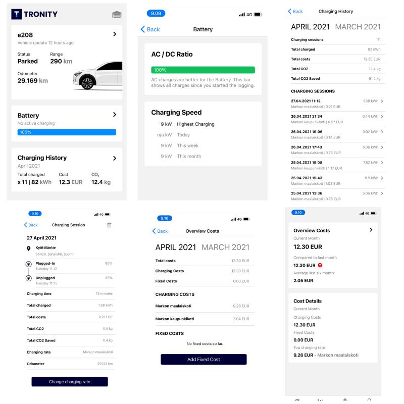 - Matkakohtaisesti: Energian keskikulutus matkoittain kWh/100 km, ulkoilman lämpötilan ja keskinopeuden, matkan keston, matkan pituuden, ajankohdan, ajetun reitin kartalla, akun varaustason muutoksen matkan aikana grafiikkana ym