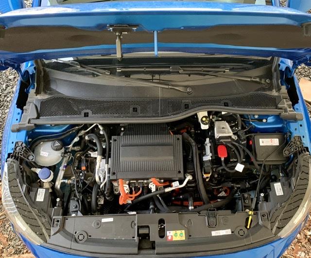 Sähköautoa lämmitetään ilmalämpöpumpulla ja jäähdytetään myös erillisellä ilmastoinnillla. Siksi auton keulalle on asennetuna 3 kW:n tehoinen 400V sähköinen ilmastointilaite ja sille kompressori. Lämmittämisestä vastaa energiatehokas lämpöpumppu, josta olen lukenut väittämän, että se tuottaisi lämpöä peräti -37°C alkaen, mutta sen teholukemista en löytänyt tietoja. Nokkapellin alla on runsaasti vielä muuta elektroniikkaa pieneen tilaa laitettuna, mutta silti olen sitä mieltä, että sinne olisi saanut edes yhden varakaapelin kokoisen frunkin järjestelemällä tavarat hieman tiiviimmin. Lämpöpumpun tietojen lähde: https://cleantechnica.com, Kuvan lähde: Groupe PSA PDF, löydetty Googlella