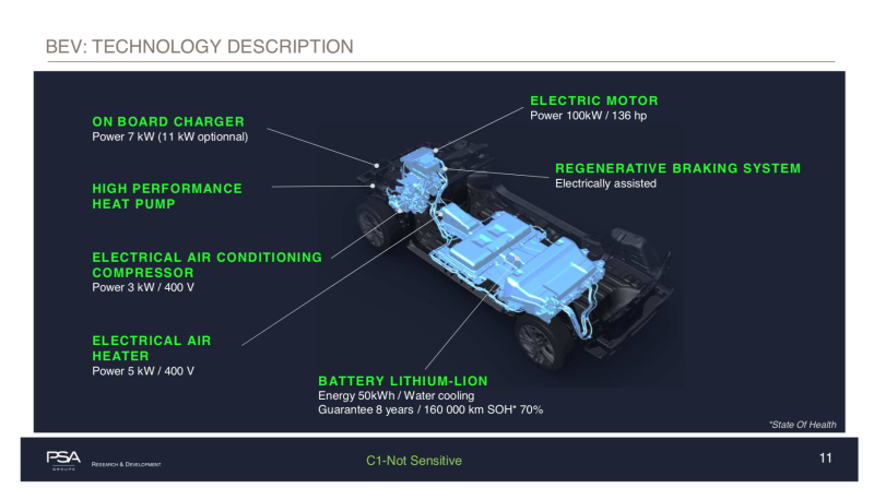 Modulaariselle e-CMP -alustalle siis kootaan useissa eri tehtaissa eri kokoisia ja näköisiä Groupe PSA:n sähköautoja, joissa on 100 kW:n tehoinen sähkömoottori, etuveto ja 45 kWh nettokapasiteetin akku. Groupe PSA:lla on jo olemassa myös pakettiautoalusta, johon samaa tekniikkaa sovelletaan mm Peugeot e-Expert, Opel e-Vivaro, Citroen vastaavassa sekä Opelin Zarifa-e Life -tila-autossa. Pakettiautoihin saa akustosta myös 27 moduulin version, jolle luvataan 75 kWh kapasiteetti. Laskemalla 18 moduulin akusta samalla suhdeluvulla, saan tulokseksi, että siitä on noin 67,5 kWh käytettävissä. Voi toki olla enemmänkin sallittu BMS:n ohjelmoinnilla.