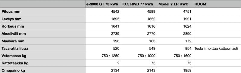 Peugeot e-3008 GT 73 kWh:n kulutus on maahantuojan hinnastossa 17,1 kWh/100 km, mutta minulle ei nyt selvinnyt oliko kyseessä WLTP-mittaustavan kulutus vai jokin muu. Löysin autolle myös WLTP-yhdistetty kulutustiedon, mikä oli vain 13,9 kWh/100 km. Se kuulostaa jopa jo epäilyttävän matalalta. ID.5 RWD 77 kWh:lla se on ilmoitettu 16,1 kWh/100 km tasolle ja Tesla Model Y LR RWD:lle on ilmoitettu 15,5 kWh/100 km. (WLTP-kulutuksissa on mukana lataushäviö).