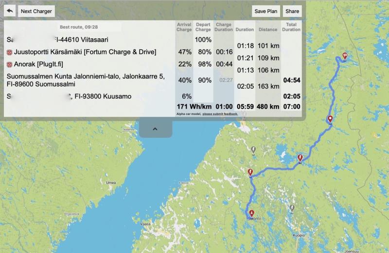 Jostain syystä ABRP ei tunnistanut toista kautta ajettaessa Suomussalmen Jaloniemitalon 32A:n Type2-latausta eikä siksi halunnut millään sieltä kautta ehdottaa reittiä. Sain kuitenkin uskottavan ja järkevämmän reitin tätä kautta suunniteltua, kun manuaalisesti määrittelin reittipisteiksi sekä Kajaanista pikalatauksen, että Suomussalmen Type2:sen.