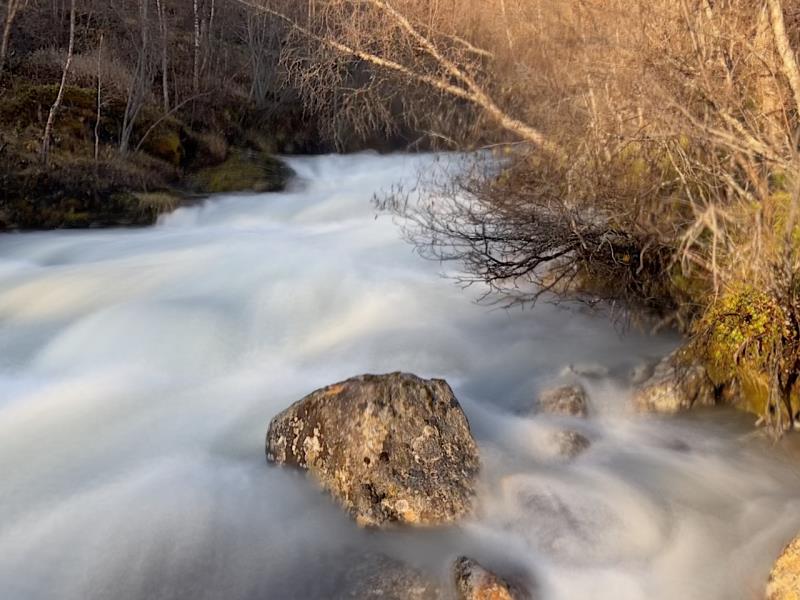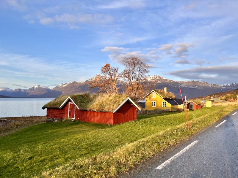 Merenpinnan tasolle Yykeänvuonolle päästyämme maisema muuttui jälleen ruskan värittämäksi ja noin keli lämpeni +10°C lukemiin. Silmiä hivelivät alhaalla olevat ruskan ja virheän nurmen värit ja niitä säestävät lumihuippuiset vuoret. Maisemista nauttien ajoimme yhdellä lataustauolla sekä usammalla ihailutauolla mökkimajoitukseemme.
